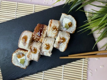 Рис, нори, угорь, сыр сливочный, такуан, соус Унаги и кунжут