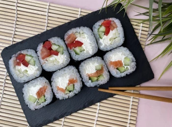 Рис, нори, лосось, сыр сливочный, огурец, томат, перец болгарский