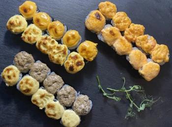 Теплые роллы с беконом, лососем,креветкой, тунцом, курой, крабом